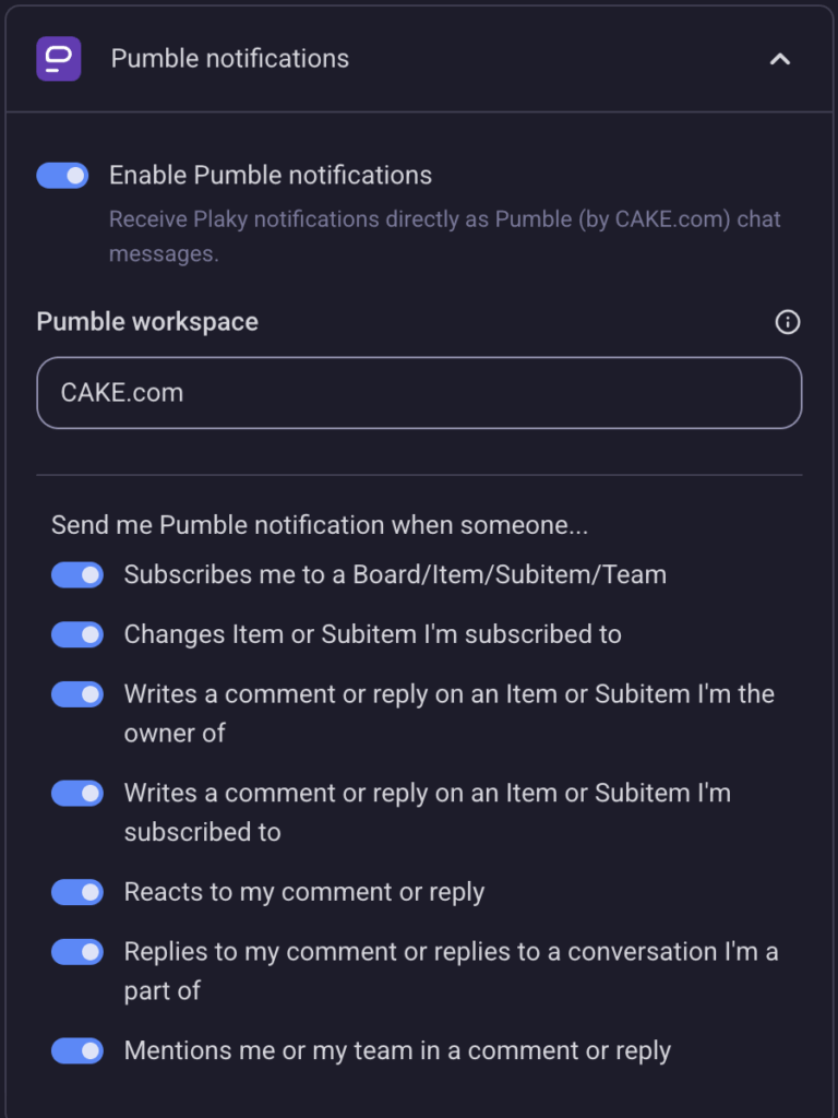 Of course, you can always choose which notifications you want to receive. To do this, open your Plaky workspace, go to Preferences —> Notifications —> Pumble Notifications.