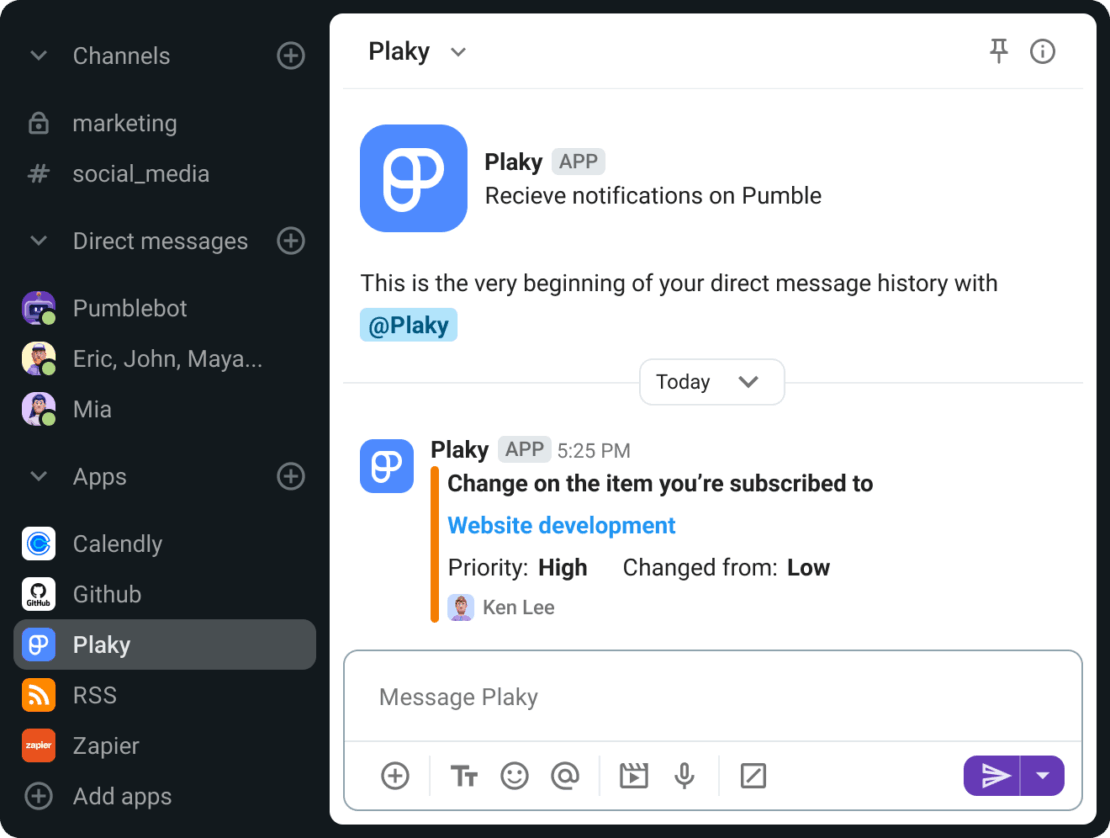 So, next time someone subscribes you to a Board/Item/Subitem/Team in Plaky, or changes something in an Item you’re subscribed to, or mentions you in a comment — you’ll see it in your DMs in Pumble.